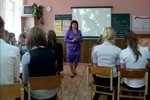 На фото: Л╕л╕я Гребенець веде урок л╕тератури за творч╕стю Т. Г. Шевченка в 9 клас╕