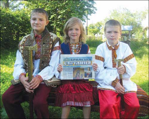 На фото: МАЛЕНЬК╤ ГУЦУЛИ З КОСМАЧА ЧИТАЮТЬ «КРИМСЬКУ СВ╤ТЛИЦЮ» ╤ «ДЖЕРЕЛЬЦЕ». КРИМЧАНИ, БЕР╤МО ПРИКЛАД!