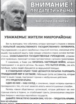 Якщо кримськ╕ владоможц╕ визнають не лише за собою, а й за вс╕ма кримчанами «право на власну думку та ╖╖ в╕льне висловлювання», ТОД╤ ЧОМУ: — у С╕мферопол╕ розклеюють лист╕вки з портретами голови Кримського КУНу В. Овчарука та ╕нших укра╖нських актив╕ст╕в, де вони називаються «предателями Крыма»? — у кримських тролейбусах крутять антимайдан╕вськ╕ в╕деоролики-страшилки з виступом голови Ради м╕н╕стр╕в АРК А. Могильова? — у Севастопол╕ нещодавно спалено автомоб╕ль л╕дера молод╕жного крила парт╕╖ «УДАР», м╕сцевого жителя Д. Б╕лоцерк╕вця? — у С╕мферопол╕ минуло╖ суботи делегати кримського Форуму ╓вромайдан╕в були змушен╕ проводити св╕й мирний зах╕д просто неба ╕ п╕д охороною м╕л╕ц╕╖?