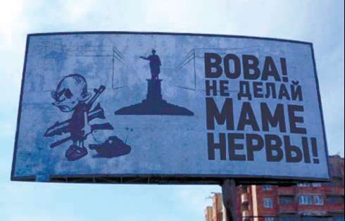 У переддень Великодня Одеса-мама на св╕й манер прив╕тала з╕ святом кремл╕вського керманича. У в╕дпов╕дь на рос╕йську агрес╕ю та недавню заяву президента Рос╕╖, що Сх╕дна Укра╖на — це Новорос╕я, в Одес╕ та на прим╕ських трасах з’явилися б╕лборди, адресован╕ в╕домому нин╕ вс╕м Вов╕. На них «загальнозрозум╕лою» мовою з одеським акцентом на фон╕ м╕ського пейзажу написано: «Вова! Не делай маме нервы!». Одесити вирахували, що ╕н╕ц╕ював цю зат╕ю л╕дер громадсько╖ орган╕зац╕╖ «Як╕сть життя», депутат Одесько╖ облради Олекс╕й Гончаренко. Це припущення п╕дтвердив ╕ його запис у блоз╕ на стор╕нках «Укра╖нсько╖ правди». А серед коментар╕в на цю новину вже можна прочитати: «Одесо, спасиб╕ за позитив!», «...Одеса — це не Новорос╕я, а Новоукра╖на!».
