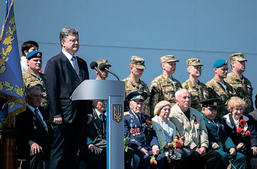 Президент запевнив ветеран╕в, що прапор Перемоги, який вони гордо несли 70 рок╕в, зараз у над╕йних руках укра╖нських солдат╕в та оф╕цер╕в.
