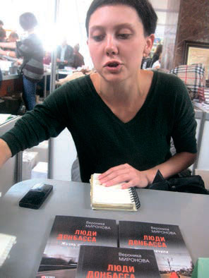 Б╕женка з Донецька Верон╕ка Миронова презенту╓ свою книгу «Люди Донбасса» на Форум╕ видавц╕в у Львов╕. Вересень 2015 р.