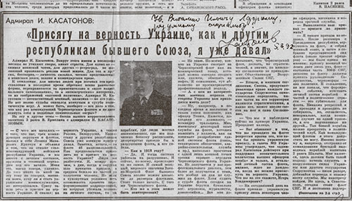 П╕сля чергово╖ по╖здки до Севастополя ╤гор Тенюх у розпач╕ в голос╕ заявив, що Укра╖на втрача╓ Чорноморський флот, треба щось робити! Я зрозум╕в, що без в╕зиту до Севастополя оф╕ц╕йних ос╕б М╕н╕стерства оборони там ситуац╕ю не зм╕нити. Тому, зважаючи на гостроту моменту, я негайно звернувся до м╕н╕стра оборони К. Морозова з пропозиц╕╓ю в╕дрядити мене до Севастополя на чол╕ оперативно╖ групи, до складу яко╖ я включив начальника служби в╕йськ генерал-майора Валер╕я Василь╓ва та по одному оф╕церу в╕д управл╕ння кадр╕в, моб╕л╕зац╕йного ╕ ф╕нансового управл╕нь та в╕дд╕лу ВМС Укра╖ни. М╕н╕стр дав згоду ╕ попросив мене тримати з ним пост╕йний зв’язок. 3 березня 1992 року я, нарешт╕, оф╕ц╕йно прибув до штабу Чорноморського флоту ╕ прибув не один, а з оперативною групою М╕н╕стерства оборони Укра╖ни. Я в╕дрекомендувався оперативному черговому ╕ попросив ауд╕╓нц╕╖ з адм╕ралом Касатоновим. Мен╕ в╕дпов╕ли, що командувач прийме мене о 17-й годин╕ одного. У призначений час я ув╕йшов до його каб╕нету. Це була наша перша особиста зустр╕ч заочних противник╕в в╕ч-на-в╕ч. Адм╕рал Касатонов ╤гор Володимирович натом╕сть виявився досить прив╕тною ╕ ц╕кавою людиною, яка зовн╕ зовс╕м була не схожою н╕ на диктатора, н╕ на зл╕сного правопорушника. Дуже енерг╕йний, ерудований, у розмов╕ напористий, комун╕кабельний, в╕н тримався впевнено ╕ рац╕онально. ╤гор Володимирович вийшов назустр╕ч ╕, прив╕тавшись за руку, спитав, чи ус╕ оф╕цери М╕н╕стерства оборони Укра╖ни ╓ буржуазними нац╕онал╕стами. Я спитав, на п╕дстав╕ чого у нього склалося таке враження. У в╕дпов╕дь в╕н показав на м╕й депутатський значок з син╕м ╕ жовтим кольором. Я пояснив, що це — кольори державного прапора Укра╖ни, як╕ походять з глибин ╖╖ ╕стор╕╖, тому заслуговують на повагу до себе, ╕ запропонував йому для отримання в╕дпов╕д╕ на сво╓ запитання щодо нац╕онал╕ст╕в послухати нов╕тню ╕стор╕ю мо╓╖ р╕дно╖ Льв╕вщини. Адм╕рал з веселою усм╕шкою запросив мене с╕сти. Я с╕в за ст╕л напроти нього ╕ розмова розпочалася. Через дек╕лька хвилин я зауважив, що наша розмова його зац╕кавила, оск╕льки вже через хвилин двадцять адм╕рал викликав ад’ютанта, наказавши подати чай ╕ печиво, що за флотськими поняттями означало прояв поваги до гостя. ╤, д╕йсно, почута з мо╖х вуст правда про розвиток пол╕тичних под╕й на заход╕ Укра╖ни, про загрозу виникнення громадянсько╖ в╕йни, про конструктивну роль командувача в╕йськ ПрикВО генерал-полковника Скокова в той складний час, про консол╕дуючу роль в сусп╕льств╕ Народного Руху Укра╖ни, про створення власних Збройних Сил Укра╖ни правовим шляхом склали на адм╕рала враження ╕ в╕н з деяким пафосом сказав, що поважа╓ народ Укра╖ни ╕ його боротьбу за незалежн╕сть. Проте в його розмов╕ в╕дчувалася образа та певне розчарування в╕д с╕чневих в╕дв╕дин Ки╓ва, оск╕льки ╤гор Володимирович дав свою дуже негативну оц╕нку кер╕вництву держави ╕ М╕н╕стерства оборони Укра╖ни. Згодом це в╕н п╕дтвердив у книз╕ з╕ сво╖ми власними спогадами. На мо╖ зауваження про права власност╕ Укра╖ни на Чорноморський флот в╕н заявив, що дотриму╓ться тако╖ позиц╕╖: ЧФ ╓ власн╕стю трьох держав – Рос╕╖, Укра╖ни ╕ Груз╕╖, базу╓ться у ╖хн╕х портах, а тому ╓ стратег╕чним ╕ п╕дпорядкову╓ться