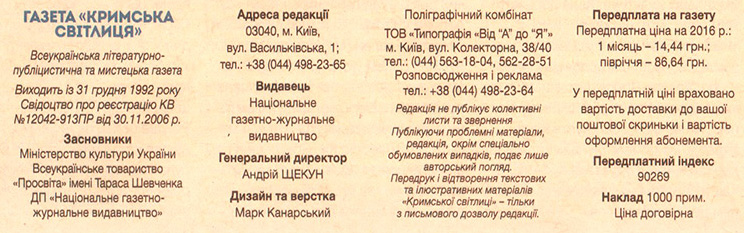 Шановна читацько-видавничо-журнал╕стська громадо (╕ юридична також)! При ус╕х суперечностях стосовно того, варто було, чи н╕ такою ц╕ною «оновлювати» на «материку» в╕дторгнуту в╕д кримських корен╕в «Кримську св╕тлицю»; виправдано, чи н╕ саме у такий брутальний спос╕б розправлятися з головним редактором ╕ залишками кримсько╖ редакц╕╖, – заклика╓мо звернути увагу на наступне. У вих╕дних даних «оновлено╖» газети значиться, що ╖╖ засновниками ╓ М╕н╕стерство культури Укра╖ни, Всеукра╖нське товариство «Просв╕та» ╕м. Т. Шевченка ╕ ДП «Нац╕ональне газетно-журнальне видавництво». М╕ж тим, у св╕доцтв╕ про ре╓страц╕ю видання, яке вказу╓ться у вих╕дних даних, зовс╕м ╕нший запис – з трудовим колективом, що легко перев╕рити на сайт╕ М╕н╕стерства юстиц╕╖ (http://dzmi.informjust.ua/home/index), яке видало це св╕доцтво у 2006 роц╕ ╕ ориг╕налу якого, до реч╕, у видавця ╕ «оновлених» сп╕взасновник╕в нема╓. Напрошу╓ться запитання: це законно? Так ╕ ма╓ бути? Знову мета виправдову╓ засоби? Отакий приклад – як «пор╕шить проблему» – пода╓ державне п╕дпри╓мство законослухняним сп╕вв╕тчизникам?! Якось не по-св╕тличному це, землячки…