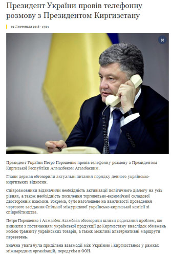 В апарат╕ президента Киргизстану спростували пов╕домлення, що з'явилося на оф╕ц╕йному сайт╕ президента Укра╖ни Петра Порошенка, про телефонну розмову з президентом Алмазбеком Атамба╓вим.