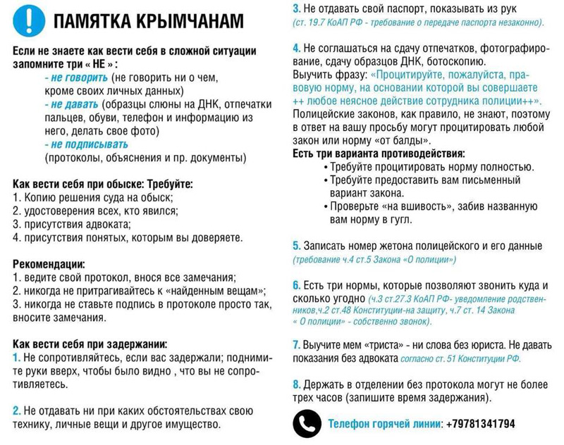Голова Меджл╕су кримськотатарського народу Рефат Чубаров закликав кримчан пост╕йно тримати при соб╕ пам'ятку по сп╕лкуванню з рос╕йськими силовиками. В╕дпов╕дну пам'ятку Чубаров опубл╕кував на сво╖й стор╕нц╕ в Facebook. "Якщо ви живете в Криму, тримайте при соб╕", - написав в╕н. У прикр╕плен╕й пам'ятц╕ йдеться про те, як сп╕лкуватися з представниками окупац╕йно╖ влади на п╕востров╕, а також присутн╕ поради про те, як вести себе п╕д час затримання та обшук╕в силовик╕в. Нагада╓мо, Рос╕я анексувала Крим у березн╕ 2014 року. Крим оголошено тимчасово окупованою територ╕╓ю. Верховна Рада Укра╖ни оф╕ц╕йно оголосила 20 лютого 2014 року початком тимчасово╖ окупац╕╖ Криму ╕ Севастополя Рос╕╓ю. 7 жовтня 2015 року президент Петро Порошенко п╕дписав в╕дпов╕дний закон. М╕жнародн╕ орган╕зац╕╖ визнали окупац╕ю та анекс╕ю Криму незаконними ╕ засудили д╕╖ Рос╕╖. Кра╖ни Заходу ввели ряд економ╕чних санкц╕й. Рос╕я заперечу╓ окупац╕ю п╕вострова ╕ назива╓ це "в╕дновленням ╕сторично╖ справедливост╕". П╕сля анекс╕╖ Криму Рос╕╓ю на п╕востров╕ регулярно проходять обшуки ╕ допити м╕сцевого населення. Правозахисники характеризують це як "боротьбу з ╕накомисленням". www.unian.ua