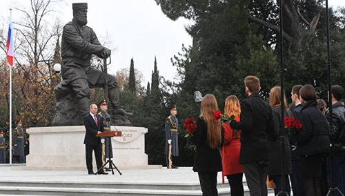 Президент РФ Володимир Пут╕н взяв участь у в╕дкритт╕ пам'ятника рос╕йському ╕мператору Олександру III, яке в╕дбулося у парку Л╕вад╕йського палацу-музею в Ялт╕. Як пов╕домля╓ РИА "Новости Крым", в╕дкриття пам'ятника в╕дбулося у суботу, 18 листопада, хоча встановлено його було ще у жовтн╕ на м╕сц╕, де ран╕ше розташовувався Малий палац. У робочому каб╕нет╕ Малого Л╕вад╕йського палацу Олександр III помер 20 жовтня 1894 року. Пам'ятник виконано з бронзи. На постамент╕ викарбувана фраза Олександра III: "У Рос╕╖ лише два союзники - ╖╖ арм╕я ╕ флот". У в╕тальн╕й промов╕ Пут╕н назвав Олександра III "видатним державним д╕ячем, людиною сильного характеру, мужност╕ ╕ незламност╕ вол╕", заявив про заслуги ╕мператора ╕ згадав, що при Олександр╕ III почалося "як╕сне переозбро╓ння рос╕йсько╖ арм╕╖" ╕ було реал╕зовано масштабн╕ кораблебуд╕вн╕ проекти, у т.ч. для Чорноморського флоту. "Олександр III вважав, що сильна, суверенна, самост╕йна держава ма╓ опиратися не лише на економ╕чну та в╕йськову могутн╕сть, але ╕ на традиц╕╖, що для великого народу важливо зберегти самобутн╕сть, а рух вперед неможливий без поваги до сво╓╖ ╕стор╕╖, культури та духовних ц╕нностей", - заявив Пут╕н, пов╕домля╓ться на сайт╕ Кремля. http://www.pravda.com.ua