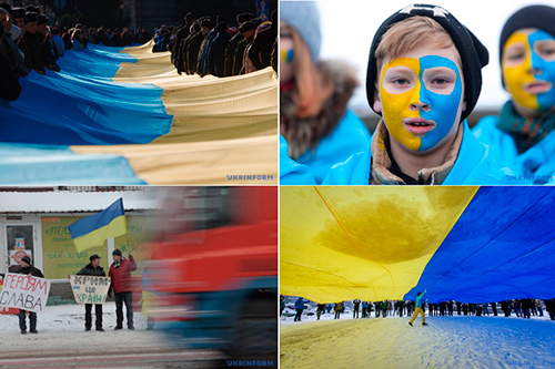 Синьо-жовт╕ кв╕ти й стр╕чки, см╕лив╕ патр╕отичн╕ мак╕яж╕ й об’╓днан╕ береги р╕чок – укра╖нц╕ в╕дзначили День Соборност╕ й 99-ту р╕чницю Акта Злуки. Найяскрав╕ш╕ мит╕ святкувань заф╕ксували фотокореспонденти «Укр╕нформу». Вшанувати ╕сторичну под╕ю – об'╓днання Сх╕дно╖ та Зах╕дно╖ Укра╖ни в одне ц╕ле – в р╕зних м╕стах вир╕шили традиц╕йною акц╕╓ю "Живий ланцюг Соборност╕". Так, на столичний м╕ст Патона з р╕зних берег╕в прийшли люди з двома частинами 30-метрового прапора й укра╖нськими стягами на плечах. У такий спос╕б утворили не лише "живий ланцюг", а й довжелезний прапор. Як сюрприз орган╕затори пригнали броньовик "Петлюра". Серед учасник╕в акц╕╖ "Живий ланцюг" Соборност╕ - об'╓дна╓мо береги Дн╕пра" було чимало школяр╕в. Кр╕м того, в Ки╓в╕ вздовж Хрещатика розгорнули рекордний нац╕ональний стяг. Полотно завдовжки 1 км 59 м 95 см створили прац╕вники Державно╖ казначейсько╖ служби. Так у центр╕ столиц╕ завершилася Всеукра╖нська акц╕я "Об’╓днаймо Укра╖ну", розпочата ще в серпн╕ 2017 року. П╕д час не╖ казначе╖ у рег╕онах поступово додавали до стягу сво╖ частини ╕з позначенням на них назв населених пункт╕в. Поки в Ки╓в╕ з’╓днували береги Дн╕пра, в Ужгород╕ гуртувалися п╕д 100-метровим синьо-жовтим стягом на берегах Ужа. Взяв участь у святкуваннях ╕ народний хор. Кр╕м Дня Соборност╕, тут в╕дзначили 72-гу р╕чницю утворення Закарпатсько╖ област╕ в склад╕ Укра╖ни. Запор╕жжя зустр╕ло День Соборност╕ флешмобом ╕ автопроб╕гом центральними вулицями м╕ста. Актив╕сти попри сильний сн╕гопад, що тривав упродовж дня, розгорнули 25-метровий державний прапор на площ╕ перед буд╕влею ЗОДА. У Харков╕ про важлив╕сть ╓дност╕ нагадували покладанням кв╕т╕в до пам'ятника Тарасу Шевченку. Хвилиною мовчання вшанували тих, хто загинув за незалежн╕сть ╕ ц╕л╕сн╕сть Укра╖нсько╖ держави, зокрема в зон╕ проведення АТО. *** З АРХ╤ВУ «КС» 22 с╕чня 2014 року у С╕мферопол╕ в╕дзначили останн╕й «доанекс╕йний» день Соборност╕: http://svitlytsia.crimea.ua/index.php?section=article&artID=12803 http://svitlytsia.crimea.ua/index.php?section=article&artID=12809
