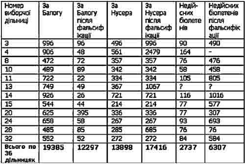 "Наша Україна" 27 квітня оприлюднила всі наявні протоколи дільничних виборчих комісій про результати голосування на виборах міського голови міста Мукачевого. Як повідомляє прес-служба "Нашої України", загалом вибори відбувалися на 36 дільницях, однак протоколи двох із них відсутні. Зокрема, на дільниці № 23, вочевидь, взагалі не складався протокол за результатами голосування. Крім цього, повністю відсутні дані голосування на виборчій дільниці № 26, що є однією з найбільших - на ній зареєстровано 3045 виборців, а у виборах взяли участь 1702. За інформацією прес-служби "Нашої України", коли підрахунок голосів майже завершився, голова комісії поскаржився на погане самопочуття і був госпіталізований - після цього всі бюлетені без складення протоколу відправили в територіальну виборчу комісію, яка визнала вибори на 26-й дільниці недійсними. Під протоколами з виборчих дільниць №№ 8, 11, 32 немає підписів голів дільничних комісій, оскільки вони після підрахунку голосів і складання протоколів відмовилися завіряти ці документи. Загалом, наголошує прес-служба, згідно з результатами протоколів, перемогу на виборах (на 26 дільницях) здобув представник "Нашої України" Віктор Балога, за якого проголосували 19379 виборців. Натомість за представника СДПУ (о) Ернеста Нусера віддали свої голоси 13896 мукачівців на 8 дільницях. Те, що скоїли із голосами виборців фальсифікатори, наочно видно з таблиці (див. внизу).
