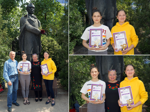 На фото: ялтинськ╕ переможниц╕ ╢лизавета ╕ Варвара Костомарови з╕ сво╓ю вчителькою В. А. Овсейчук ╕ головою оргком╕тету конкурсу «Ми – д╕ти тво╖, Укра╖но!» ╕м. Д. Кононенка В. В. Качулою