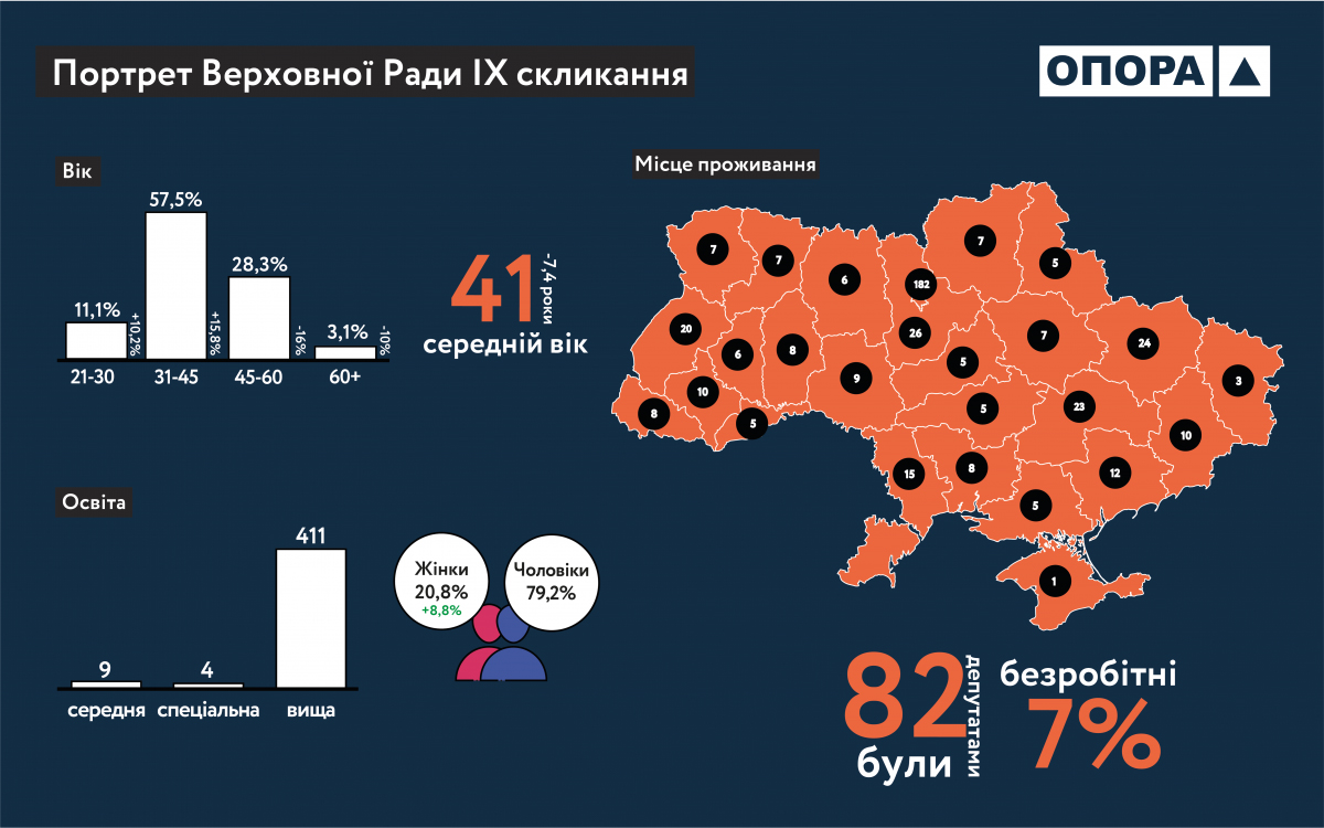 Верховна Рада 9-го скликання оновиться на 80,4%. Кр╕м того, склад парламенту помолодша╓ в середньому на 7,4 року, адже новообраних майбутн╕х нардеп╕в в╕ком 23-45 рок╕в зб╕льшилось загалом на 26%. Так╕ п╕драхунки провела орган╕зац╕я ОПОРА на основ╕ даних з майже повн╕стю опрацьованих електронних протокол╕в на сайт╕ ЦВК.