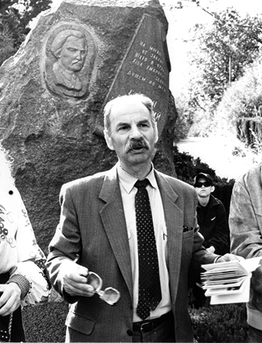 На фото: лауреат прем╕╖ ╕м. С. Руданського Данило Кононенко виступа╓ на могил╕ поета в Ялт╕, 2001 р.