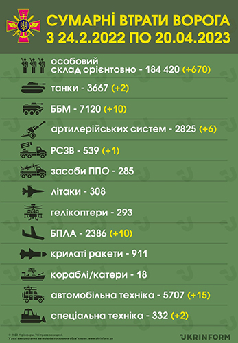 Ми з╕брали для вас ╕нформац╕ю про чотириста двадцять перший день Велико╖ в╕йни: чим жили Укра╖на та укра╖нц╕ 20 кв╕тня 2023 року.