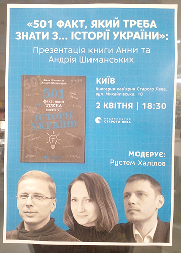 2 кв╕тня в книгарн╕-кав’ярн╕ Старого Лева в Ки╓в╕ в╕дбулася презентац╕я книги Анни ╕ Андр╕я Шиманських «501 факт, який треба знати з… ╕стор╕╖ Укра╖ни». Це ╕стор╕я Укра╖ни в╕д мамонт╕в до сьогодення у 501 факту. Ц╕кав╕, важлив╕, часом кумедн╕, ╕нод╕ траг╕чн╕, а найчаст╕ше – доленосн╕: не вс╕м цим фактам знайшлося м╕сце у шк╕льних п╕дручниках, але саме завдяки ╖м ╕стор╕я ста╓ живою ╕ динам╕чною.