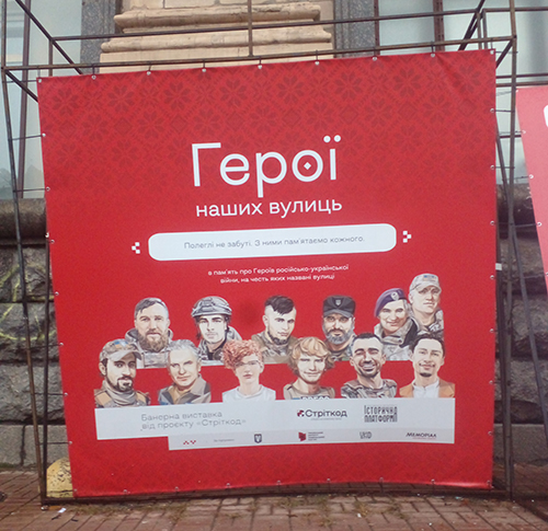 Нещодавно в Ки╓в╕, на Хрещатику в╕дкрилася банерна виставка «Геро╖ наших вулиць» в╕д проекту «Стр╕ткод». Вона присвячена дванадцяти героям рос╕йсько-укра╖нсько╖ в╕йни, на честь яких назван╕ вулиц╕. В╕к загиблих геро╖в – в╕д 21 до 56 рок╕в. Вони представляють всю Укра╖ну – в╕д Ки╓ва до ╢впатор╕╖ ╕ в╕д Закарпаття до Луганська ╕ Харкова. Про кожного героя розпов╕да╓ окремий банер. Два банери п╕д назвою «Факти про геро╖в» м╕стять ц╕каву ╕нформац╕ю про кожного ╕з представлених в╕дважних.