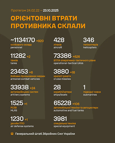 23 жовтня з 07:00 до 23:00 у 12 рег╕онах застосовуються граф╕ки погодинних в╕дключень електроенерг╕╖. Внасл╕док нових рос╕йських атак ╓ знеструмлення у Харк╕вськ╕й ╕ Черн╕г╕вськ╕й областях – НЕК «Укренерго». У м╕ст╕ Лозова Харк╕всько╖ област╕ пошкоджено критичну ╕нфраструктуру, знеструмлен╕ 25 тисяч абонент╕в.