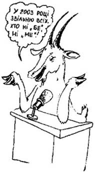 Гряде рік Кози. Не свині-кабана, не пацюка чи бика, а гарної біленької кізки. Пора увіковічити цю достойну тварину у її рік. Найперше, у кожному селі звести їй величні пам'ятники. Для цього створити фонди, щоб хитрі люди могли їх подоїти і збудувати собі будинки на два - три, а то й більше поверхів. Не забути випустити календарі, на яких у різних позах мають фігурувати найкращі кози світу. Так само провести традиційні шоу-конкурси "Пані Коза-2003" чи "Міс Коза". Пора зняти величний серіал "Коза-дереза", чисто на українському матеріалі за американські гроші для російського телебачення, каналів типу "Інтер", "1 коза + 1 коза". В ньому розкрити стражденне життя кози-дерези, яка живе з облупленим боком, без хати, теплої і гарячої води, наймаючи квартиру в зайця. І взагалі, казку "Коза-дереза" вивчати з першого до дванадцятого класу, щоб діти, вийшовши зі школи, крім анекдотів про вчителів, знали ще й рідну класику. До того ж, перейменувати відомий роман Панаса Мирного на "Хіба мекають кози, як ясла повні?". Належить поставити на столичній сцені рок-оперу "Вовк і семеро козенят". На кожному будинку розвішати казкові гасла "Пий, Іванку, - козенятком станеш". При цьому не забувати й про фільми для чоловіків, а тому створити для них мультсеріал "Цап та баран". Надалі вважати образливим для національної гідності українців слово "казьол", замінивши його на "цап". Меншин це не стосується. Так само чоловікам слід внести корективи в арсенал пестливих слів для жінок і замість всяких "моя кицю", "моє левенятко", "моя лебідко" вживати "моя кізко", "кізочко моя" тощо. У театрах - жодної комедії, лише трагедії, адже це слово з давньогрецької означає "пісня козлів". У моді цього року будуть "козлячі борідки" у чоловіків і шубки із козлячого хутра в жінок. Популярним знову стане козяче молоко, воно по праву вважатиметься найсмачнішим і вживатиметься як ліки. Не забуваймо, що Робінзон теж розводив кіз - і з голоду не вмер. І, насамкінець, не забувайте, що рік відкриває сузір'я Козерога. З Новим роком вас, коземани!