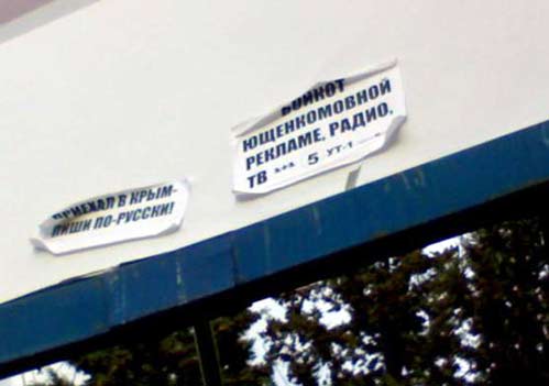 Ц╤КАВО, що в╕дчу╓ чи то наша, чи то при╖жджа здалеку людина, як╕й на в’╖зд╕ до Ялти у в╕ч╕ кинеться ось ця войовничо-загрозлива пересторога: «ПРИЕХАЛ В КРЫМ - ПИШИ ПО-РУССКИ!»? Спочатку, може, просто ц╕каво стане, як той напис на так╕й височин╕ опинився – чи то в пана хул╕гана ноги так╕ довг╕, чи то наст╕льки сильно в╕н любить рос╕йську мову, що й небо ладен закле╖ти такими лист╕вками? А «БОЙКОТ ЮЩЕНКОМОВНОЙ РЕКЛАМЕ, РАДИО, ТВ»? Вс╕лякого про р╕дну мову начувся – ╕ “галицько-волинський д╕алект”, ╕ “бандер╕всько-фашистське нар╕ччя”, але щоб «ющенк╕вська мова» – даруйте. Що воно таке - «ющенкомовна» реклама ╕ з чим ╖╖ ╖дять? Чому це ви раптом державну мову перейменували на ющенк╕вську? Ой, шов╕н╕сти ви мо╖ золотеньк╕, вже би хоч В╕ктора Андр╕йовича спитали, чи прийме в╕н на себе таку честь? (Наш читач з Ялти чомусь не назвав себе. «Кримський майдан» заклика╓ дописувач╕в скр╕зь ╕ всюди залишатися самими собою ╕ не ховатися за псевдон╕мами!).