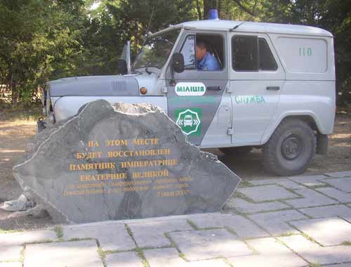 Б╕ля пам’ятного каменя Катерин╕ Друг╕й в одному з╕ сквер╕в С╕мферополя пост╕йно перебувають к╕лька м╕л╕ц╕онер╕в. Вони кажуть, що охороняють його в╕д зловмисник╕в, котр╕ намагаються знищити кам╕нь. Дос╕ була лише одна спроба цього. 2 червня м╕ська влада, яку контролю╓ Парт╕я рег╕он╕в ╕ Рос╕йський блок, урочисто встановила пам’ятний кам╕нь, к╕лька сотень кримських татар та укра╖нц╕в намагалися скинути кам╕нь у р╕чку Салгир, що прот╕ка╓ поруч. Цьому зашкодили б╕йц╕ "Беркута". Однак л╕дер Меджл╕су кримськотатарського народу Мустафа Джем╕л╓в тод╕ заявив, що кримськ╕ татари н╕коли не допустять встановлення на м╕сц╕ каменя пам’ятника розпусн╕й ╕ кривав╕й цариц╕. Начальник Головного управл╕ння МВС Укра╖ни в Криму Анатол╕й Могильов скаржиться, що кримська м╕л╕ц╕я несе значн╕ витрати через те, що змушена охороняти цей кам╕нь. Як м╕н╕мум, кам╕нь охороняють 16 ос╕б, а ще 2 автомоб╕л╕. "Якщо я зараз зн╕му охорону з нього ╕ зламають цей пам’ятник, то завтра в Криму розпочнеться ламання пам’ятник╕в ╕ншо╖ конфес╕╖", - каже Анатол╕й Могильов. В╕н пов╕домив, що м╕л╕ц╕я ма╓ оперативну ╕нформац╕ю про нам╕ри певних людей, якщо кримськ╕ татари зруйнують кам╕нь, зруйнувати ╖хн╕ святин╕, зокрема, могилу в╕домого кримськотатарського д╕яча Ед╕ге Киримала у Бахчисара╖. Заступник голови Меджл╕су Рефат Чубаров мотивац╕ю начальника кримсько╖ м╕л╕ц╕╖ назвав непереконливою ╕ в ╕нтерв’ю Рад╕о Свобода заявив, що м╕л╕ц╕я краще б охороняла кладовища - мусульманськ╕, юдейськ╕ ╕ християнськ╕, де почаст╕шали акти вандал╕зму. В╕н вважа╓, що начальник кримського главку м╕л╕ц╕╖ повинен подати до суду на С╕мферопольську м╕ськраду, щоб в╕дшкодувати витрати правоохоронц╕в. Рефат Чубаров бачить тут пол╕тику: "Як один з представник╕в одн╕╓╖ з правоохоронних структур пан Могильов мав би ╕н╕ц╕ювати з’ясування вс╕х правових аспект╕в, пов’язаних ╕з охороною незаконно встановленого об’╓кта, на що незаконно витрачаються кошти правоохоронних орган╕в. Тут треба шукати як╕сь пол╕тичн╕ моменти, можливо, пов’язан╕ з виборами, що розпочалися в Укра╖н╕". ╤, схоже, Рефат Чубаров знайшов цей пол╕тичний момент, пов’язавши те, що Анатол╕й Могильов дос╕ ╓ депутатом Мак╕╖всько╖ м╕ськради в╕д Парт╕╖ рег╕он╕в, а мер С╕мферополя Геннад╕й Бабенко, який ╕н╕ц╕ював встановлення пам’ятного знаку Катерин╕, його однопарт╕╓ць. (RadioSvoboda.Ua).