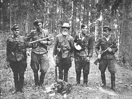 На фото: Група повстанц╕в з ТВ-21 “Гуцульщина”. Зл╕ва направо: Назар╕й Данилюк-“Перебийн╕с” (Буковина); сотник ╤ван Дмитрович Кулик-“С╕рий”; Василь Скригунець-“Гамал╕я”, командир сотн╕ важких кулемет╕в “Черемош” (родом ╕з села Стопчат╕в Кос╕вського р-ну, зв╕дки ╕ Д. Павличко); сотник Петро Мельник-“Хмара” (командир ТВ-21 “Гуцульщина”); Микола Харук-“Вихор”, командир сотн╕ ╕м. ╤. Богуна.