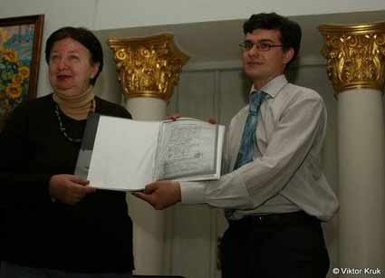 На фото: Олександр Алфьоров презенту╓ Конституц╕ю Орлика 1710 року у Музе╖ гетьманства (директор музею Галина Ярова л╕воруч). Фото В╕ктора Крука.