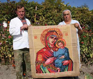 На фото О. Носаненка: подружжя Яценк╕в з вишитим образом Божо╖ Матер╕.