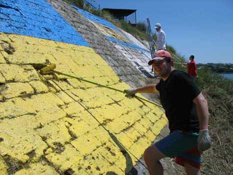 ╤снують наскальн╕ малюнки, що збер╕гаються стол╕ттями. За ними вивчають ╕стор╕ю людства. У Севастопол╕ зам╕сть наскальних – малюнки наст╕нн╕, але колись, дума╓ться, за ними вивчатимуть ╕стор╕ю становлення державност╕ у Криму. Те, що Севастополь перенасичений державною символ╕кою Рос╕╖ – видно неозбро╓ним оком, досить опинитися у центр╕ м╕ста. Б╕ля Графсько╖ пристан╕ височ╕╓ Будинок Москви, поруч Будинок оф╕цер╕в Чорноморського флоту РФ, навпроти, на пагорб╕ – штаб Чорноморського флоту Рос╕╖. Величезн╕ прапори, що майорять над цими буд╕влями, виготовлен╕ поза будь-яким стандартами. У лещатах цих трьох установ Рос╕╖ загубилися буд╕вл╕ держадм╕н╕страц╕╖ та м╕ськради. Варто ще додати, що просто за м╕ськрадою знаходиться причал, вздовж якого вишикувалися в╕йськов╕ корабл╕ Чорноморського флоту Рос╕╖. В╕д Графсько╖ пристан╕ до П╕вн╕чно╖ сторони курсують катери, перевозячи мешканц╕в та гостей Севастополя. Причал, на який висаджуються пасажири, розташований просто впритул до в╕йськово╖ частини того ж таки Чорноморського флоту Рос╕╖. Там, за п╕дп╕рною ст╕нкою, орендована, хот╕лося б спод╕ватися – не нав╕чно, територ╕я ╕ншо╖ держави. Але по цей б╕к, про це варто пам’ятати – все наше, укра╖нське: прибережна смуга й та ж таки п╕дп╕рна ст╕нка. З Графсько╖ пристан╕ добре видно протилежний берег бухти й вищеозначену ст╕нку. Тобто, вона кида╓ться в око будь-кому, хто опинився у центр╕ м╕ста. Саме ця п╕дп╕рна ст╕нка вже два роки ╓ об’╓ктом неабияких пристрастей: на н╕й малюють державн╕ символи Укра╖ни та Рос╕╖. Все почалося у 2009 роц╕, коли пророс╕йськ╕ орган╕зац╕╖ м╕ста зобразили на ст╕нц╕ триколор. Рос╕йська преса тод╕ рясн╕ла пов╕домленнями про в╕чне прагнення севастопольц╕в в╕д’╓днатися в╕д Укра╖ни. Молодь, як╕й не байдуж╕ процеси становлення державност╕ у Криму та, зокрема, у Севастопол╕, в╕дреагувала наст╕нним зображенням жовто-блакитного прапора поруч з триколором. Про миролюбн╕сть помисл╕в останн╕х св╕дчило слово «дружба», втиснуте м╕ж прапорами двох держав. Проте, дружба не входила до план╕в симпатик╕в Рос╕╖ й через р╕к вони замалювали п╕вслова «дружба» зображенням Андр╓╓вського прапора. Державники в боргу не залишилися й решту слова замалювали прапором В╕йськово-Морських Сил Збройних Сил Укра╖ни. Затямивши, що дружба з прихильниками Рос╕╖ не виходить, вони м╕ж символ╕кою двох держав написали слово «мир». «Якщо сепаратистськ╕ орган╕зац╕╖ проти дружби, то ми будемо примушувати ╖х до миру», - сказав тод╕ журнал╕стам л╕дер громадського руху «За Укра╖ну» Дмитро Б╕лоцерковець (на фото угор╕). Зимова негода руйнувала фарби, навесн╕ м╕ж плитами ст╕нки проросла трава, зображення символ╕в двох держав почали втрачати форму, а за нею й зм╕ст. Першими похопилися прихильники рос╕йського триколора: матроси в╕йськово╖ частини знищили бур’яни, що псували зображення. Молод╕ державники з в╕дпов╕ддю не забарилися: до Дня м╕ста вони поновили жовто-блакитний прапор, зробивши у такий спос╕б подарунок городянам. Акц╕я, у як╕й взяли участь близько 30 севастопольц╕в, пройшла без п╕дтримки будь-яких пол╕тичних сил. Кошти на фарби та приладдя збирали в складчину. При╓мно було бачити,- каже Дмитро Б╕лоцерковець, - як деяк╕ городяни, з╕йшовши з катера на