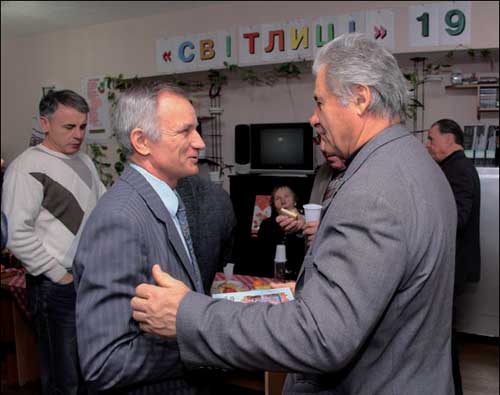 На фото: Валентин Негода (праворуч) на 19-р╕ччя «Кримсько╖ св╕тлиц╕» вруча╓ сво╖ книги для редакц╕йно╖ б╕бл╕отеки.