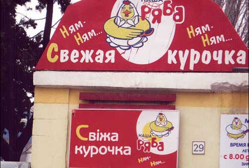 Тепер детальн╕ше про Ки╖в та його околиц╕. Дивно, але й у столиц╕ ста╓ б╕льше двомовних вив╕сок. Укра╖нська найчаст╕ше по╓дну╓ться з рос╕йською або англ╕йською, але бува╓, що з японською, китайською, ╕тал╕йською, н╕мецькою тощо. Ось приклади: «Агентство нерухомост╕ «Благовест». Або ж: «Цветы / Кв╕ти», «Ресторан Мар╕о. Клуб Марио», «Салон краси «Луна». В останньому випадку «Луна» могла б означати ╕ «в╕длуння», але поряд — малюнок М╕сяця. Так що або власники салону не знають укра╖нсько╖, або вважають, що рос╕йською буде красив╕ше. Ех, комплекси наш╕, комплекси…
