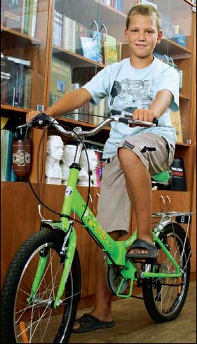 На фото — учасник конкурсу, учень 6 класу СНВК «Л╕нгв╕ст» м. С╕мферополя Богдан Шимох╕н з призовим велосипедом