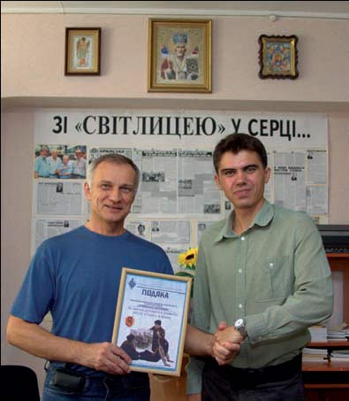 ЗА ЗНАЧНУ ДОПОМОГУ в розвитку Нац╕онально╖ скаутсько╖ орган╕зац╕╖ Укра╖ни «Пласт» у Криму голова окружно╖ пластово╖ старшини Микола Яриновський (праворуч на фото) вручив редакц╕╖ «Кримсько╖ св╕тлиц╕» Почесну грамоту з подякою.