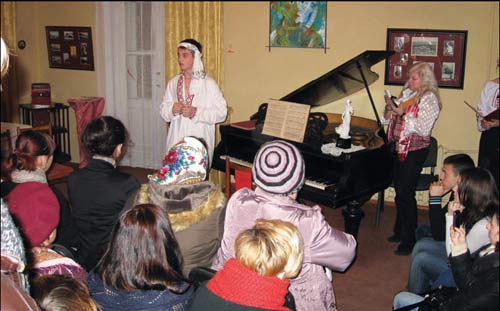 Продовження святково╖ програми в╕дбувалося у затишн╕й зал╕ музею, яка нав╕ть виявилася замалою для тако╖ велико╖ к╕лькост╕ глядач╕в. Тут ще раз кожен мав змогу переконатися, наск╕льки багатогранною ╓ постать Лес╕ Укра╖нки. ╥╖ житт╓вий шлях та творчий доробок надихають л╕тератор╕в, театрал╕в, художник╕в, музикант╕в, науковц╕в… Тут, в ошатн╕й в╕тальн╕й зал╕ музею глядач╕ поринули у св╕т музики, почувши гру рояля та бандури. ╤нтелектуальна гра «Знавц╕ «Л╕сово╖ п╕сн╕» серед студент╕в 4 курсу допомогла в╕дчути казкову атмосферу та зустр╕тися з героями в╕домо╖ драми-фе╓р╕╖ Лес╕ Укра╖нки – «Л╕сово╖ п╕сн╕», св╕т яко╖ чару╓ вже не одне покол╕ння. Як не дивно, але це був саме той випадок, коли в ╕нтелектуальн╕й гр╕ переможця не виявилося.