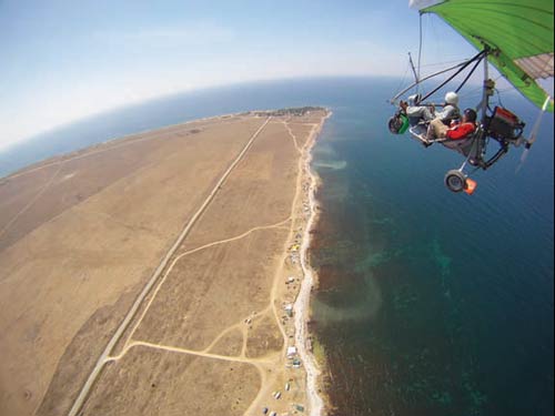 Вл╕тку я в╕дпочивав на п╕востров╕ Тарханкут у Зах╕дному Криму. Море було холодним, але розваг вистачало. Найц╕кав╕шою розвагою був пол╕т на мотодельтаплан╕. Звичайно, я лет╕в пасажиром. Мене припнули пасами до сид╕ння.