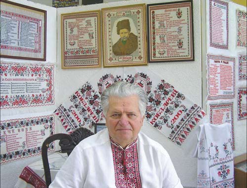 Готуючись до 200-р╕ччя з дня народження Тараса Шевченка, в ╤рп╕нському ╕сторико-кра╓знавчому музе╖ на початку жовтня в╕дкрили незвичайну виставку — «Вишитий Кобзар». Автор вишивок — ╤ван Рябчук. В╕н народився в 1941 роц╕ в сел╕ Петр╕вське (до перейменування Юшк╕в Р╕г) Таращанського району на Ки╖вщин╕. Вже йшла в╕йна. Батько — ╤ван Корн╕йович Рябчук — був штурманом л╕така. В╕н ╓диний уц╕л╕в з усього ек╕пажу, коли л╕так було збито. П╕вроку провалявся в г╕пс╕. Пот╕м воював у п╕хот╕. Спочатку командиром взводу, а п╕сля поранення командував ротою. Батько знову був поранений, але повернувся додому живий. Пот╕м батьки перебралися в Умань на Черкащин╕. Батько, який зак╕нчив б╕олог╕чний факультет Дн╕пропетровського ун╕верситету, працював викладачем в Уманському педучилищ╕ ╕м. Т. Г. Шевченка, а мати зав╕дувала б╕бл╕отекою Уманського пед╕нституту ╕м. Павла Тичини. ╤ван Рябчук у 1959 роц╕ зак╕нчив Льв╕вське музичне училище, пот╕м вступив до Н╕жинського пед╕нституту ╕м. Гоголя. З третього курсу студента Рябчука забрали в арм╕ю. Доучувався в╕н уже п╕сля проходження строково╖ служби. ╤ван Рябчук з 1970 до 2009 року викладав хорове й оркестрове диригування в Уманському педучилищ╕, водночас грав на домр╕ в оркестр╕ народних ╕нструмент╕в цього ж училища. Оркестр був лауреатом р╕зних конкурс╕в. Мати ╤вана ╤вановича В╕ра Павл╕вна все життя вишивала — рушники, картини, штори, скатертини. Вся хата була у вишивках. ╤ван вир╕с у цьому вишитому св╕т╕ укра╖нсько╖ народно╖ культури. На виставц╕ експону╓ться материна вишивка — ╕кони, рушники, серветки, скатертина ╕ три краватки, як╕ В╕ра Павл╕вна вишила для чолов╕ка ╕ двох син╕в. На сорокар╕ччя ╤вана ╤вановича мама вишила рушник з побажанням «Хай щастить тоб╕, сину». Мами вже нема╓, а ╖╖ побажання щастя дос╕ перед очима в сина. 8 жовтня мам╕ виповнилося б 95 рок╕в, але вона померла в 2002-му. За життя мами ╤ван Рябчук не вишивав. Т╕льки допом╕г трохи вишити тло на ╕конах. А коли мама померла, почав вишивати. У В╕ри Рябчук не було доньки, ╕ ╖╖ мистецтво перейшло до сина. Спочатку ╤ван ╤ванович вишив портрет Тараса Шевченка ╕ в╕рш «Запов╕т». Узори взяв у журнал╕ «Ж╕нка». Пот╕м вишив в╕рш «Думи мо╖», пот╕м — «Тече вода». Нин╕ в доробку ╤вана Рябчука понад двадцять серветок, вишитих в╕ршами Тараса Шевченка. ╤ван ╤ванович вишива╓ поруч з в╕ршем ╕н╕ц╕али Кобзаря, дату ╕ м╕сце написання поез╕╖, а також сво╖ ╕н╕ц╕али та дату й м╕сце вишивання. Кожна людина може знайти в «Кобзар╕» щось сво╓. Ось вишивка поез╕╖ Тараса Шевченка: