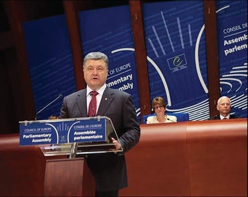 Шановна пан╕ Президент! Шановний Генеральний секретар! Шановн╕ члени Асамбле╖! Дорог╕ учасники! Дякую за запрошення виступити перед Асамбле╓ю. Вдячний за можлив╕сть донести до цього поважного форуму голос укра╖нського народу з р╕зних куточк╕в Укра╖ни – сх╕дних та зах╕дних, п╕вн╕чних та п╕вденних, в╕льних ╕ окупованих. Минув лише м╕сяць п╕сля завершення президентсько╖ кампан╕╖, п╕д час яко╖ я об’╖здив усю Укра╖ну. Я побачив ╖╖ миролюбною, гостинною до вс╕х та ╓вропейською – не лише за розташуванням, але й за покликанням. Укра╖на завжди була гостинним домом для кожного, хто приходив з миром. На жаль, сьогодн╕ цей д╕м у небезпец╕. Знайшлась сила, яка прийшла в Укра╖ну не з миром. У нашому повсякденному словнику знову з’явилися слова «анекс╕я», «сепаратизм», «найманц╕». Що ми можемо зробити для того, щоб зупинити насильство ╕ не допустити його перетворення на повномасштабну в╕йну? На жаль, сьогодн╕ це питання стосу╓ться не лише Укра╖ни. Воно стосу╓ться вс╕╓╖ ╢вропи. Шановн╕ члени Асамбле╖! Все почалося минулого листопада, коли колишня влада забрала в укра╖нц╕в мр╕ю, в╕дмовившись в╕д ╓вропейсько╖ ╕нтеграц╕╖, не спитавши укра╖нц╕в ╕ не давши взам╕н н╕чого, кр╕м корупц╕╖ та нехтування людською г╕дн╕стю. Укра╖на п╕днялася ╕ почалася Революц╕я Г╕дност╕. Народ перем╕г. Ця перемога далась великою кров’ю ╕ великими жертвами. Рос╕я, яка двадцять рок╕в тому в обм╕н на ядерну зброю об╕цяла п╕клуватися про суверен╕тет Укра╖ни, всупереч Великому договору м╕ж Укра╖ною та Рос╕╓ю, всупереч Будапештському меморандуму, який пооб╕цяв мир в обм╕н на трет╕й за розм╕ром в св╕т╕ ядерний арсенал, стала агресором ╕ зруйнувала стаб╕льн╕сть в цьому рег╕он╕. А разом з ним – ╕ систему баланс╕в ╕ противаг у сучасному св╕т╕. З ц╕╓╖ трибуни я хот╕в би в╕д ╕мен╕ вс╕х укра╖нц╕в подякувати Рад╕ ╢вропи, ╕ особливо ╖╖ Парламентськ╕й Асамбле╖, за негайне реагування на в╕йськову агрес╕ю. Ця п╕дтримка конче була потр╕бна ╕ залиша╓ться потр╕бною для Укра╖ни. Р╕шення Ком╕тету М╕н╕стр╕в ╕ Парламентсько╖ Асамбле╖ становлять правову основу для подальшого в╕дновлення справедливост╕ та забезпечення прав ус╕х людей, як╕ проживають на окупованих територ╕ях. Треба зупинити факти ф╕нансування та озбро╓ння терористичних груп у Донецьк╕й та Луганськ╕й областях, як╕ все ще в╕дбуваються з боку Рос╕йсько╖ Федерац╕╖. Бо фактично це другий етап агрес╕╖. У 2008 роц╕ ми це спостер╕гали в Груз╕╖. У 2014 роц╕, на жаль, це в╕дбува╓ться за рахунок суверен╕тету Укра╖ни. ╤ питання «хто буде наступним?» ╓ в╕дкритим. ╤ саме тому ╢вропа зараз ма╓ продемонструвати сп╕льн╕сть ╕ сол╕дарн╕сть. Бо проблема для ╢вропи сьогодн╕ – це в╕дсутн╕сть реального механ╕зму збереження миру, захисту територ╕ально╖ ц╕л╕сност╕ та демократ╕╖. Бо пово╓нна модель була зруйнована, ╕ зараз на наш╕ з вами плеч╕ ляга╓ в╕дпов╕дальн╕сть за створення ново╖ модел╕. Без в╕дчуття реальност╕ легко створити сусп╕льний ╜рунт для агрес╕╖. ╤, на жаль, сьогодн╕ агрес╕я переповню╓ рос╕йське сусп╕льство. Вона лежить в основ╕ ╕ пол╕тики, ╕ сусп╕льного ставлення до Укра╖ни з боку Рос╕йсько╖ Федерац╕╖. Але Укра╖на протиставля╓ ╖й переконан╕сть ╕ моральну силу. Очевидно, що без повернення Криму нормал╕зац╕