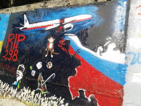 Уже наступного дня п╕сля того, як в Донецьк╕й област╕ пророс╕йськ╕ терористи знищили «Boeing-777», на узбережж╕ Одеси з’явилося граф╕т╕ на знак пам’ят╕ 298 пасажир╕в, як╕ загинули у ц╕й ав╕акатастроф╕. На п╕дп╕рн╕й ст╕нц╕ пляжу на 16-╕й станц╕╖ Великого Фонтану художник Святослав Лаврусенко зобразив на сво╓му малюнку злочинну руку Рос╕╖, яка накинула смертельний зашморг на цив╕льний л╕так, що прямував по курсу Амстердам (Н╕дерланди) — Куала-Лумпур (Малайз╕я). Розм╕стивши зображення граф╕т╕ на сво╖й стор╕нц╕ «ВКонтакт╕», Святослав додав до цього лише к╕лька речень. «Сво╓ стр╕т-арт я намалював на м╕сц╕ попередньо╖ роботи – «Пут╕н пожира╓ Крим», яку комунальники казна-чому зафарбували. Нове граф╕т╕ присвячене пам’ят╕ людей, що загинули у результат╕ терористичного акту. Без коментар╕в. Вшану╓мо хвилиною мовчання...». Загалом юний одеський соц╕альний художник уже створив ц╕лу панораму граф╕т╕ на пляжн╕й ст╕нц╕. Тут ╕ в╕льна, незалежна Укра╖на в образ╕ д╕вчини з вишиваним рушником, ╕ сцена побиття актив╕ст╕в столичного Майдану «беркут╕вцями», ╕ зображення розв’язано╖ Кремлем в╕йськово╖ агрес╕╖ на Донбас╕. Святослав каже: «Я малюю лише правду. А це, схоже, не вс╕м до вподоби. Спод╕ваюся, що нова робота протрима╓ться довше. На цьому зупинятися не збираюся: окр╕м пол╕тичних малюнк╕в, планую створити ще й сер╕ю яскравих поетичних граф╕т╕».
