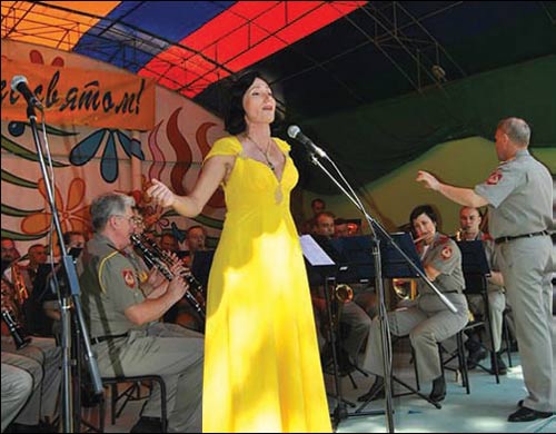 Визволен╕ укра╖нськ╕ м╕ста поступово повертаються до мирного життя. Чимало зусиль для цього докладають в╕йськовослужбовц╕ Збройних Сил Укра╖ни. Вони розм╕новують важлив╕ м╕ськ╕ комун╕кац╕╖, допомагають в перевезенн╕ продукт╕в, надають медичну допомогу. А в Краматорську за сприяння в╕йськовослужбовц╕в сил АТО взагал╕ трапилась неординарна под╕я для всього м╕ста. На в╕дкрит╕й сцен╕ в центральному м╕ському парку в╕дбувся святковий концерт на честь визволення м╕ста. Його п╕дготували ╕ дали для мирних мешканц╕в музиканти та артисти з Нац╕онального Президентського оркестру. У м╕ст╕ на цей концерт чекали з нетерп╕нням, адже з моменту окупац╕╖ Краматорська бойовиками тут не було жодного свята. Люди боялись нав╕ть вийти на вулицю. А тепер все м╕сто розфарбувалось у жовто-блакитн╕ кольори. Стр╕чки в косах, на руках, державн╕ прапори Укра╖ни — в╕д маленьких до найб╕льших, як╕ т╕льки можна втримати в руках, написи на футболках ╕ сумках… Люди кажуть, що просто втомились боятися ╕ дуже рад╕ тому, що можна бути собою ╕ в╕льно казати, що ти – УКРА╥НЕЦЬ. Так само з гарним настро╓м та великим натхненням при╖хали сюди ╕ музиканти. — Коли нам було запропоновано при╖хати в це славне м╕сто Донбасу, то весь колектив виявив бажання виступити перед мешканцями Краматорська, — зазначив директор Нац╕онального Президентського оркестру, заслужений д╕яч мистецтв, п╕дполковник запасу ╤ван Москаленко. — Ми дуже хочемо п╕дняти настр╕й цим людям ╕ показати, що за них вбол╕ва╓ та ╖х п╕дтриму╓ вся Укра╖на. Спец╕ально для краматорц╕в музиканти п╕дготували к╕лькагодинну програму, до яко╖ ув╕йшли як твори св╕тово╖ класики, укра╖нськ╕ народн╕ п╕сн╕ та музика, а також кращ╕ музичн╕ та п╕сенн╕ композиц╕╖ вже з сучасного укра╖нського надбання. ╤ до слова сказати, краматорц╕ щедро нагородили оплесками артист╕в, оц╕нивши таланти таких сп╕вак╕в як В╕ктор╕я Осадчук та Серг╕й Гурець. Буквально зачарував аудитор╕ю грою на баян╕ В╕тал╕й Сахацький. Також городянам припала до душ╕ гра таких музикант╕в як Микола ╤щук, Серг╕й Коцар╕й, Олександр Лобортас. А Олександр Род╕онов просто «з╕рвав» серед слухач╕в «бомбу з гарним настро╓м», виконавши за п╕д-тримки оркестру, яким керував диригент, заслужений д╕яч мистецтв Серг╕й Золотарьов, запальну карпатську «Ватру». Письменник Фед╕р Шишман надав шалений заряд бадьорост╕, продекламувавши з╕ сцени власн╕ в╕рш╕. ╤мпров╕зована зала перед сценою була вщент заповнена людьми, як╕ прийшли послухати чудову музику та сп╕ви. ╤ нав╕ть п╕сля завершення люди довго не хот╕ли в╕дпускати музикант╕в. П╕д вигуки «браво-б╕с», вони з╕йшли з╕ сцени та виконали деф╕ле вже безпосередньо перед глядачами.