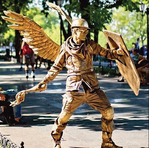 Одесити вже звикли до появи на вулицях ╕ площах у центр╕ м╕ста живих статуй. Заробляючи на хл╕б насущний, позував ╕ фотографувався з бажаючими ╕ Стан╕слав Домбровський у костюм╕ славнозв╕сного Остапа Бендера. А нин╕ його вже можна бачити в образ╕ во╖на Небесно╖ Сотн╕. Перевт╕лився аматор п╕д впливом духу нашо╖ доби, вир╕шивши створити образ актуального героя. А громадсько╖ активност╕ кер╕вников╕ одеського театру-студ╕╖ «╥жачок у туман╕», що д╕╓ при благод╕йному фонд╕ «Дорога до Дому», Стан╕славу не браку╓. ╤дея створити такий персонаж народилася п╕сля лютневих под╕й на столичному ╢вромайдан╕. Вигадливий костюм ╕ бутафор╕ю за його еск╕зами виготовляли у кримськ╕й театральн╕й майстерн╕. А коли там зрозум╕ли, що саме вони зробили, то неабияк злякалися репрес╕й. Тож до Одеси обладунки во╖на довелося переправляти контрабандою, що значно п╕двищило ╖хню варт╕сть. Загалом, на створення образу довелося витратити б╕льше семи тисяч гривень. А в родин╕ саме склалася складна ситуац╕я, бо при сходженн╕ на Монблан загинув батько дружини. Тож Стан╕слав як годувальник с╕м’╖ вир╕шив було продати костюм. Та коли друз╕ побачили його оголошення про це у Фейсбуц╕, вони прийшли йому на допомогу, щоб во╖н Небесно╖ Сотн╕ залишився в Одес╕. ╤ з тих п╕р на Приморському бульвар╕ мало не щодня можна бачити живу статую одного з Геро╖в Небесно╖ Сотн╕. Повн╕стю покритий бронзовим в╕дт╕нком персонаж ма╓ за спиною два великих ангельських крила, в одн╕й руц╕ в╕н трима╓ щит ╕з гербом Укра╖ни, а у друг╕й – пляшку з коктейлем Молотова. Стан╕слав каже, що може стояти, не рухаючись, в одн╕й поз╕ чотири з половиною години. Ус╕ кошти, зароблен╕ в╕д ц╕╓╖ вистави, в╕н вир╕шив передавати на благод╕йн╕сть. «Я вважаю, що люди гинули у Ки╓в╕ на Майдан╕ не заради того, щоб зараз ╕шла в╕йна. М╕й персонаж символ╕зу╓ прагнення людей до свободи, його завдання сприяти п╕днесенню бойового духу во╖н╕в, як╕ воюють на сход╕, — каже Стан╕слав Домбровський. — Це не б╕знес-проект, зароблен╕ кошти я в╕ддаю мо╖м друзям, як╕ беруть участь в АТО. А ще допомагаю матер╕ально театру-студ╕╖ при фонд╕ «Дорога до Дому», де через мистецтво люди з╕ складною долею, наркозалежн╕ стають чистими». Стан╕слав Домбровський – один ╕з актив╕ст╕в одеського Майдану, який щовечора приходить до пам’ятника Дюку. Коли я цими днями зустр╕в його там, в╕н, називаючи себе жидобандер╕вцем, читав сво╖ патр╕отичн╕ в╕рш╕. У них звучить горд╕сть за Одесу й Укра╖ну, як╕ нев╕д’╓мн╕ в╕д ╢вропи.