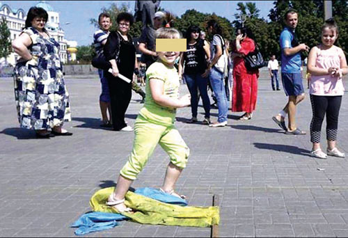 П╕д час жахливого «параду в╕йськовополонених» у Донецьку, коли сепаратисти прогнали центральною вулицею захоплених у полон укра╖нських в╕йськовик╕в, маленька д╕вчинка розтоптала укра╖нський прапор. Фото цього моменту опубл╕кувала користувач Facebook Ганна Молчанова. «Про Донецьк. Як страшно. Для нас сьогодн╕шн╕й «парад» полонених став потряс╕нням. А ще от так╕ зн╕мки...» — написала вона. П╕сля публ╕кац╕╖ фото посипалися обурен╕ коментар╕. «Реально соромно за Донецьк! Це реальне бидло, яке було клеймом для справжн╕х донеччан!» — написав один користувач. «Донецьк помер. Для вс╕х нас», — констату╓ ╕нший...