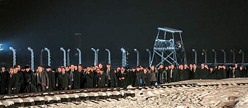 27 с╕чня Президент Укра╖ни Петро Порошенко з дружиною взяв участь у заходах з нагоди вшанування 70-╖ р╕чниц╕ зв╕льнення концтабору Аушв╕ц-Б╕ркенау в польському Освенцим╕. Разом з Главою держави до польського Освенцима при╖хала колишня ув’язнена концтабору дев’яностор╕чна Анастас╕я Гулей та дев’яностор╕чний учасник бо╖в за визволення в’язн╕в концтабору Аушв╕ц-Б╕ркенау Микола Карпенко. Також на заходах були присутн╕ делегац╕╖ з понад 40 кра╖н, зокрема, президенти Франц╕╖ Франсуа Олланд, Н╕меччини Йоах╕м Гаук, Литви Даля Грибаускайте, президенти Хорват╕╖, Австр╕╖, Словен╕╖, Швейцар╕╖, Мальти, а також Король Бельг╕╖ Ф╕л╕п ╤, Великий Герцог Люксембургу Анр╕, Король Н╕дерланд╕в В╕ллем-Олександр. Учасники церемон╕╖ взяли участь у сп╕льному молебн╕ пам’ят╕ за невинно уб╕╓нними жертвами концтабору Аушв╕ц-Б╕ркенау. П╕сля цього вони ╕з запаленими лампадками пройшли так званим шляхом смерт╕ — дорогою, якою йшли в’язн╕ концтабору до крематор╕ю, де ╖х спалювали. Дал╕ представники делегац╕й поклали лампадки на дошки пам’ят╕ з написами нац╕ональними мовами. Концтаб╕р Аушв╕ц-Б╕ркенау в 1940-1945 роках був одним ╕з найб╕льших нацистських концтабор╕в. За р╕зними даними, за роки ╕снування в концтабор╕ було знищено б╕льше 1 млн. людей, переважна б╕льш╕сть з яких ╓вре╖, але серед вбитих було багато й укра╖нц╕в. 27 с╕чня 1945 року в’язн╕в Аушв╕ц-Б╕ркенау було зв╕льнено. 27 с╕чня щороку в╕дзнача╓ться М╕жнародний день пам’ят╕ жертв Голокосту.