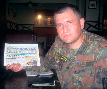 Цього б╕йця я зустр╕в у Ки╓в╕. ╥хня невеличка компан╕я складалася з трьох чолов╕к: мешканець окуповано╖ частини Донбасу, ╕нтел╕гентний, спок╕йний галичанин ╕ ось цей кримчанин, гордий син Присиваського степу. Вс╕ вони — добровольц╕ ╕ нац╕лен╕ воювати до перемоги. Тр╕шки перепочивши у столиц╕, хлопц╕ збиралися вже наступного дня в╕д'╖жджати на передову. Було у мене ╕з собою к╕лька прим╕рник╕в «Донеччини» та один номер «Кримсько╖ св╕тлиц╕» ╕з нашим незабутн╕м Данилом Кононенком на титульн╕й стор╕нц╕. Роздав усе нашим захисникам. Кримчанин погодився сфотографуватися для газети, т╕льки просив не називати н╕ пр╕звища, н╕ населеного пункту, з якого походить. Тому скажу одне — степовик. Але й за св╕й випалений степ цей мужн╕й укра╖нець готовий воювати до останнього подиху. Я розпов╕в б╕йцю, що великий поет Криму Данило Кононенко помер п╕д час чергового наступу сепаратист╕в з╕ словами: «Б╕дна моя Укра╖но...». Зворушений кримчанин, який, до реч╕, розмовляв пристойною укра╖нською мовою, сказав: «За вс╕х помстимося. ╤ за наших кримських поет╕в, ╕ за десятки, сотн╕ тисяч б╕женц╕в з Донбасу. Перемога буде за нами!». Тож побажа╓мо кримчанину повернутися переможцем!