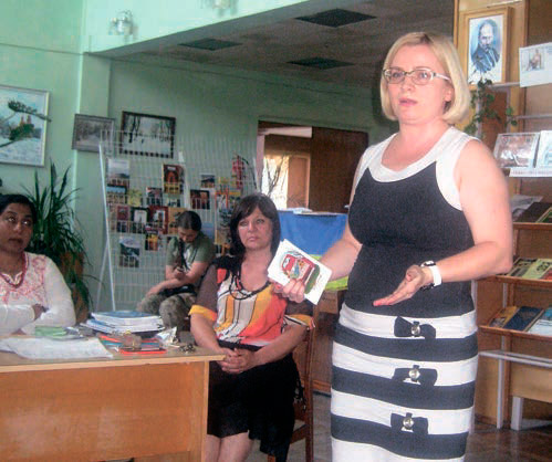 Серед запрошених вид╕лялися формою б╕йц╕ АТО (батальйон «С╕ч»), вони спец╕ально задля ц╕╓╖ под╕╖ на п╕вдня покинули передову — в╕д них виступали Василь Вовкунович та Максим Лютий. Одразу вп╕знав знайоме обличчя правозахисниц╕ ╕ перекладачки твор╕в укра╖нсько╖ л╕тератури Мр╕дули Гош. Вона народилася в ╤нд╕╖, але вже багато рок╕в живе в Ки╓в╕. Востанн╓ ми бачилися з нею роки три тому… Якщо вже ╕ Мр╕дула у Слов’янську — це добрий знак! Ця людина зна╓, як в╕дстоювати права свого народу, не принижуючи права ╕нших нац╕й. ╥╖ досв╕д на Донбас╕ точно не зашкодить. ╤ хоча тут лише дв╕ велик╕ нац╕ональн╕ групи — укра╖нц╕ та рос╕яни, проте ╕сну╓ велика пр╕рва м╕ж «╓вропейцями» ╕… «ватниками». Це все одно, що два р╕зних етноси. Серед гостей був ╕ начальник в╕дд╕лу осв╕ти Слов’янсько╖ м╕сько╖ ради Вадим Овчаренко. Найпалк╕шим, найемоц╕йн╕шим був виступ директора б╕бл╕отеки Лариси Мамедово╖, яка так ╕ не змогла, за ╖╖ словами, перерахувати вс╕х друз╕в б╕бл╕отеки — в╕д Львова до Луганська. Прес-оф╕цер батальйону «С╕ч» Максим Лютий наголосив на важливост╕ ╕дейного згуртування укра╖нц╕в у ц╕й неоголошен╕й в╕йн╕. Зах╕д, який планувався за сценар╕╓м на дв╕ години, тривав ус╕ чотири — кожен присутн╕й хот╕в под╕литися з друзями сво╖ми враженнями та спогадами. Начальник в╕дд╕лу осв╕ти наголосив на тому, що таке ╓днання заходу ╕ сходу Укра╖ни, таке братерство дружн╕х орган╕зац╕й, сп╕льнот нада╓ натхнення осв╕тянам ╕ допомага╓ зд╕йснювати нац╕онально-патр╕отичне виховання на приклад╕ м╕сцевих геро╖в. — Якщо ран╕ше б╕бл╕отеки були установами прихистку застар╕лих думок ╕ кадр╕в, — сказав в╕н, — то сьогодн╕ наша м╕ська Центральна б╕бл╕отека згуртувала навколо себе вс╕ нац╕онально св╕дом╕ орган╕зац╕╖ та ╓ вз╕рцем, на який треба р╕внятись. Не будемо приховувати, що у нашому м╕ст╕ дуже багато супротивник╕в Укра╖нсько╖ держави — ╕ це ще б╕льше поклада╓ на нас в╕дпов╕дальн╕сть за молоде покол╕ння, яке ми разом вихову╓мо.