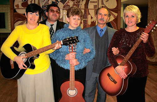 2003 р╕к. Кримськ╕ «сп╕ваюч╕» учительки Катерина Степчин (крайня праворуч), Тетяна Ковальова ╕ Наталя Мух╕на з г╕тарами, виграними в орган╕зованому «Кримською св╕тлицею» п╕сенному конкурс╕ «Льв╕вська струна — на кримський лад!». Також на фото кримськотатарський ╕ укра╖нський поети Юнус Кандимов ╕ Данило Кононенко, яких з нами вже нема...