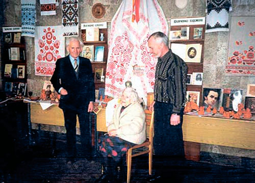 80-т╕ роки минулого стол╕ття. Виставка майстр╕в народно╖ творчост╕ в Ялтинському культурному центр╕. Зл╕ва направо: заслужений прац╕вник культури Укра╖ни Олекс╕й Нирко, майстриня-вишивальниця В╕ра Ро╖к, скульптор Микола Вакуленко