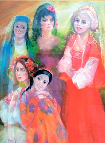 Кожна картина за сюжетом ╕ колористикою не повторю╓ ╕ншу. Прим╕ром, кримськ╕ татарки з╕йшлися б╕ля джерела, азербайджанки зустр╕лися за питтям чаю. Голуб╕нь моря по╓дну╓ться з волошковими мр╕ями естонок, в╕рменок зачарував гранатовий веч╕р…