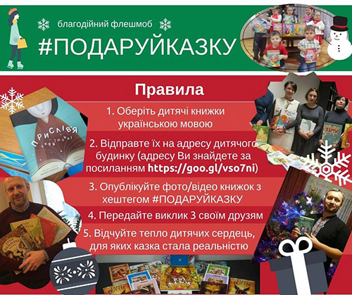 Соц╕альн╕ мереж╕ Facebook та ВКонтакте п╕дкорив новий благод╕йний флешмоб: учасники на сво╖х соцстор╕нках публ╕кували в╕део/фото сучасних укра╖номовних книг та дарували ╖х д╕тям-сиротам. Акц╕ю п╕дтримали в╕дом╕ народн╕ депутати, дипломати, пол╕тконсультанти та активна молодь. Дитяч╕ укра╖нськ╕ письменники також долучились до флешмобу #ПОДАРУЙКАЗКУ. Наприклад, школи та дитяч╕ будинки Донецько╖ област╕ отримали у подарунок книги укра╖нсько╖ сп╕вачки, поетеси Лес╕ Горово╖. Над╕йка Герб╕ш запрошу╓ вс╕х охочих долучитись до благод╕йно╖ акц╕╖: "Ми вс╕ зараз страшенно багато говоримо про те, щоб зм╕нити ц╕лу кра╖ну. Але ц╕ зм╕ни часто починаються з╕ зм╕ни маленького простору довкола конкретних маленьких людей. Довкола себе, довкола найр╕дн╕ших. ╤ довкола тих, про чий прост╕р н╕кому подбати достатньо уважно – наприклад, про прост╕р д╕ток, як╕ з певних причин залишен╕ в притулках. ╤ хоча б╕льш╕сть ╕з нас не ма╓ змоги взяти в свою родину сироту, ми все одно можемо долучитися до створення ╖╖ простору. Наприклад, даруючи книжки, як╕ в╕дкриють ╖й нов╕ св╕ти, нов╕ мр╕╖, нов╕ бачення. Одн╕╓ю справд╕ хорошою книжкою ми да╓мо як╕йсь дитин╕ мостик, вудку, човен, нав╕ть рят╕вний круг. ╤ саме тому я долучаюся до ц╕╓╖ акц╕╖". До зимових свят вихованц╕ дитбудинк╕в та шк╕л-╕нтернат╕в у рамках флешмобу #ПОДАРУЙКАЗКУ отримали понад 3000 книг у подарунок. До реч╕, дарувати казку д╕тям можна впродовж року, адже долучитись до флешмобу #ПОДАРУЙКАЗКУ може кожен охочий - правила участ╕ прост╕ (див. ╕люстр.).