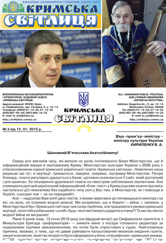 Шановний В'ячеславе Анатол╕йовичу! На св╕й лист до Вас в╕д 18.02.15 р. про незаконну в╕дмову Державним п╕дпри╓мством «Нац╕ональне газетно-журнальне видавництво» друкувати газету «Кримська св╕тлиця» отримала в╕дпов╕дь в╕д Вашого заступника пана Р.В.Каранд╓╓ва. Коп╕ю ц╕╓╖ в╕дпов╕д╕ пересилаю Вам для ознайомлення й оц╕нки. Я категорично заперечую наведен╕ у в╕дпов╕д╕ аргументи. Цитую: «Редакц╕я газети знаходиться на тимчасово окупованих територ╕ях, що унеможливило ╖╖ д╕яльн╕сть, а отже ╕ розповсюдження газети…» Цитую дал╕: «випуск тимчасово переведений в електронний формат… вс╕ числа газети регулярно розм╕щуються на сайт╕…» Сам╕ собою напрошуються висновки: 1. Незважаючи на дуже складну ситуац╕ю, редакц╕я «Кримсько╖ св╕тлиц╕» на окупован╕й територ╕╖ продовжу╓ працювати «в унеможливлених умовах» й видавати газету (в електронному формат╕). Газета укра╖нська, справд╕ патр╕отична й, найголовн╕ше, вельми ц╕кава. Тако╖ згармон╕зовано╖ по вс╕х сферах укра╖нського буття газети б╕льше нема╓. Одна з найкращих в Укра╖н╕ газет! 2. «…унеможливило… розповсюдження газети» саме Державне п╕дпри╓мство «Нац╕ональне газетно-журнальне видавництво», яке належним чином прореагувало на важку патр╕отичну роботу редакц╕╖ «в унеможливлених умовах» й заборонило ╖╖ друк. Поки газета видавалася, колектив редакц╕╖ самотужки орган╕зовував пересилку екземпляр╕в газети п╕дписантам. 3. Пор╕вняйте, будь ласка, патр╕отичну позиц╕ю редакц╕╖ газети й вищезгаданого Державного п╕дпри╓мства, яке лиша╓ можливост╕ укра╖нських громадян на окупован╕й територ╕╖ Криму почути голос з Укра╖ни. Шановний В'ячеславе Анатол╕йовичу! Я щиро сп╕вчуваю тим труднощам, як╕ Вам доводиться долати на такому в╕дпов╕дальному посту в цей тривожний для Укра╖ни час. Тим не менш, прошу Вас особисто вир╕шити п╕дняте питання, Вашим п╕длеглим воно, зда╓ться, не п╕д силу. Треба, конче треба захистити й зберегти для Укра╖ни цю газету та ╖╖ редакц╕ю. Ст╕льки рок╕в вона вже працю╓ в Криму «в унеможливлених умовах» й безумовно на це заслугову╓.
