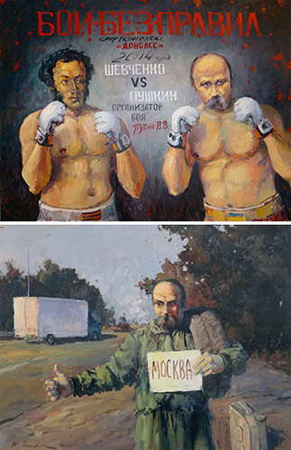 Революц╕я Г╕дност╕ та во╓нн╕ д╕╖ на Сход╕ Укра╖ни формують нове сусп╕льне сприйняття образу Тараса Шевченка. Шевченко ста╓ живим геро╓м навколишньо╖ д╕йсност╕. На картин╕ молодого полтавського художника Юр╕я Шаповала «Аф╕ша» Тарас Шевченко ╕ Олександр Пушк╕н зображен╕ в образах боксер╕в. П╕дпис пов╕домля╓ про ╖хн╕й по╓динок у бою без правил у спорткомплекс╕ «Донбас». Але це не заклик до боротьби укра╖нсько╖ ╕ рос╕йсько╖ культур. Ще один напис на «Аф╕ш╕» вказу╓, що орган╕затор цих бо╖в – Пут╕н В.В. Саме нин╕шн╕й рос╕йський президент агрес╕╓ю проти Укра╖ни змусив укра╖нц╕в ╕ рос╕ян вбивати одне одного. Пут╕н бо╖ться народу. На ╕нш╕й картин╕ Шаповала «Подорож Григоровича» Шевченко з автомоб╕льними шинами ╕ кан╕строю ╖де в Москву. Натяк прозорий: рос╕яни можуть взяти за приклад укра╖нську Революц╕ю Г╕дност╕. От Пут╕н ╕ розпочав в╕йну проти Укра╖ни. Картина Юр╕я Шаповала «Настанови Григоровича» адресована д╕тям. Тут художник зобразив Шевченка в образ╕ сенсея, який да╓ настанови черепашкам-н╕ндзя. Ки╖вський художник Андр╕й ╢рмоленко представив Тараса Шевченка в образах повстанця ╕ супермена. Тарас Шевченко залиша╓ться на позиц╕ях л╕дера, чи╖ ╕де╖, л╕тературн╕ та художн╕ твори ╓ смислоутворюючими ╕ актуальними для нового покол╕ння укра╖нц╕в.