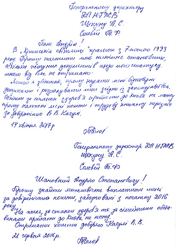 Шановн╕ читач╕, а насамперед - колеги-журнал╕сти! Я н╕коли б не звертався ось так публ╕чно до вас, якби справа стосувалася мене особисто. З╕ мною, з 2000-го року головним редактором «Кримсько╖ св╕тлиц╕», зв╕льненим тор╕к гендиректором Нац╕онального газетно-журнального видавництва А. Щекуном «за прогули», принаймн╕, все б╕льш-менш визначено: справа про мо╓, схоже на розправу, зв╕льнення перебува╓ у Касац╕йному суд╕, ╕ рано чи п╕зно, але ╕менем Укра╖ни буде остаточно проголошено, чи маю я жити дал╕ з цим плювком в душу ╕ б╕ограф╕ю (див. https://www.facebook.com/permalink.php?story_fbid=1123554201049516&id=192473467490932&substory_index=0), чи гендиректора-плювальника поставлять, врешт╕, на м╕сце. Але моя колега по «Кримськ╕й св╕тлиц╕», котра працю╓ в газет╕ практично з моменту ╖╖ заснування, з лютого 1993 року, редактор в╕дд╕лу Тамара Федор╕вна Соловей на сьогодн╕ взагал╕ не зна╓, у якому вона перебува╓ статус╕, оск╕льки до останнього часу продовжувала трудитися у С╕мферопол╕ над наповненням сайту «Кримсько╖ св╕тлиц╕», як╕й в╕ддала майже чверть в╕ку життя, ╕ не отримувала з Ки╓ва, з Газетно-журнального видавництва, де збер╕га╓ться ╖╖ трудова книжка, жодних оф╕ц╕йних документ╕в, наказ╕в, лист╕в, пов╕домлень, як╕ б цей статус пояснювали. А ще Тамара Федор╕вна, сама немолода вже ж╕нка, ╕нвал╕д 2 групи, яка недавно поховала свою стареньку маму, вже майже п╕втора роки – з 1 с╕чня 2016 року – не отриму╓ за свою працю з бухгалтер╕╖ того видавництва ЖОДНО╥ КОП╤ЙКИ. Якщо вже бути зовс╕м точним, ОДИН Р╤К ╤ ЧОТИРИ М╤СЯЦ╤ – ЖОДНО╥ КОП╤ЙКИ! Ось чому, знаючи, що я збираюся до Ки╓ва для проведення ф╕налу конкурсу «Ми – д╕ти тво╖, Укра╖но!», моя колега попросила мене передати гендиректору НГЖВ А. Щекуну свого листа до нього ╕ написан╕ на мо╓ ╕м'я дов╕реност╕ для отримання ╖╖ трудово╖ книжки ╕ розрахунку, якщо вона д╕йсно зв╕льнена. Подолавши в соб╕ «найпалк╕ш╕» почуття до пана плювальника, заради колеги, я наступного дня п╕сля конкурсу таки переступив пор╕г того НГЖВ. Передав папери, попросив зробити для Т. Соловей коп╕ю ╖╖ наказу про зв╕льнення, якщо вона д╕йсно зв╕льнена. П╕сля нервових пошук╕в у в╕дд╕л╕ кадр╕в заявили, що наказу знайти не можуть, коли Т. Соловей зв╕льнена – не знають, а кер╕вник т╕╓╖ державно╖ контори А. Щекун пов╕домив, що йому потр╕бен час на пошуки ╕ прийняття р╕шення ╕ що в╕н пов╕домить про це через тиждень. ╤ справд╕, через тиждень я отримав в╕д нього електронною поштою два отак╕ листи (стиль ╕ все ╕нше збережено):