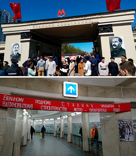 У Москв╕ в рамках "╕сторично╖ реконструкц╕╖" до 82-╖ р╕чниц╕ запуску метропол╕тену б╕ля входу на станц╕ю "Сокольники" вив╕сили портрети радянського диктатора Йосипа Стал╕на та ╕деолога геноциду проти укра╖нц╕в Лазаря Кагановича. Про це пов╕домля╓ видання "Крим.Реал╕╖". ╤н╕ц╕атором цього д╕йства 14 травня виступило кер╕вництво метропол╕тену. У рамках "реконструкц╕╖" у вестибюл╕ станц╕╖ "Сокольники" також розм╕стили банер ╕з написом: "Великому, р╕дному Стал╕ну, ╕н╕ц╕атору й натхненнику буд╕вництва метро – пролетарський прив╕т!". Видання зазнача╓, що в окупованому Севастопол╕ 6 травня в╕дкрили приурочену до Дня перемоги виставку картин на в╕йськову тематику "Жива пам'ять", у як╕й, за словами кер╕вництва музею, центральне м╕сце пос╕в портрет Йосипа Стал╕на. www.unian.ua